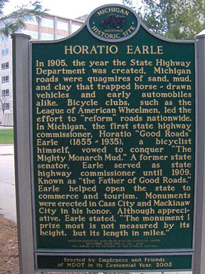 Horatio Earle, who came to Michigan in 1889, quickly became entrenched in politics, giving the Good Roads Movement a fervent supporter in our great state. Having gained a seat in the Michigan Senate, Earle pushed through legislation to create the State Highway Department, now known as the Michigan Department of Transportation.
